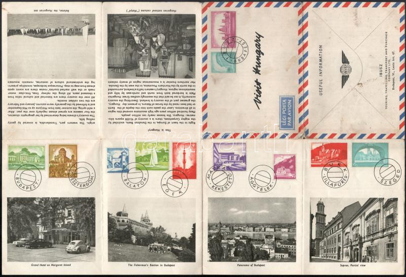 Beschreibung: cca 1960 Visit Hungary, az IBUSZ angol nyelvű, fekete-fehér képekkel illusztrált idegenforgalmi ismertető prospektusa, kihajtva: 40,5x27,5 cm