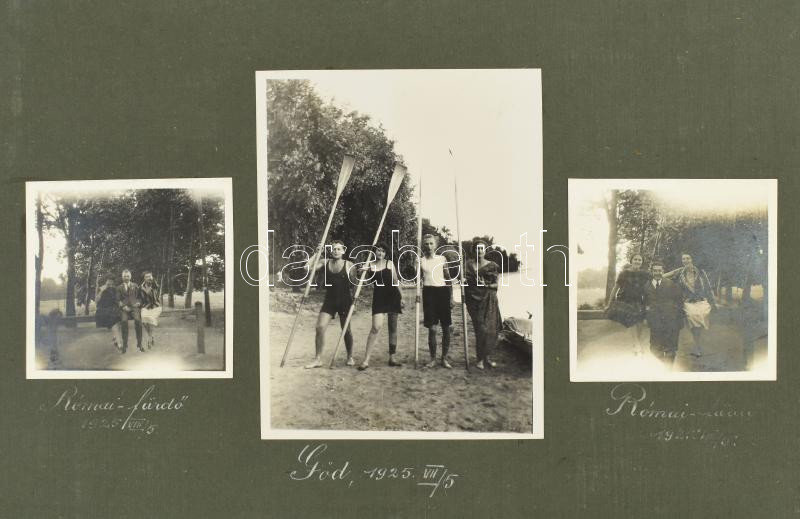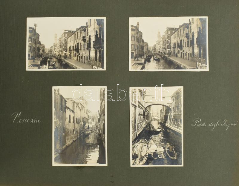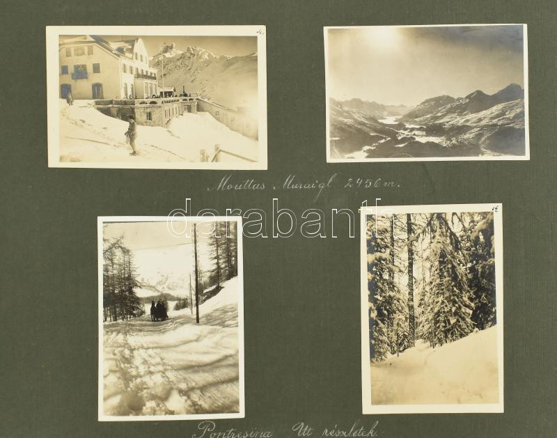 1924-1926 között készült felvételek albumba ragasztva, az albumlapok feliratozva (János-hegy, Zugliget, Göd, Szent-Endrei sziget, Római fürdő, Pontresina, St. Moritz, Genova, Venezia), 80 db vintage fotó, ezüst zselatinos fotópapíron, 6x6 cm és 12,8x17,8 cm között, album mérete 21,5x30 cm