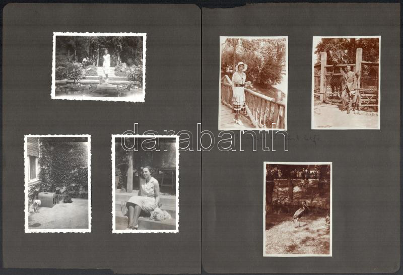 1931 Esztergomi strandfürdőben készült privát felvételek, 5 db vintage fotó, ezüst zselatinos fotópapíron, az albumlapon feliratozva, két albumlapra felragasztva, ezek hátoldalán további hat fotó látható, 6x9 cm vagy ehhez közeli méretekben, karton 24x18 cm