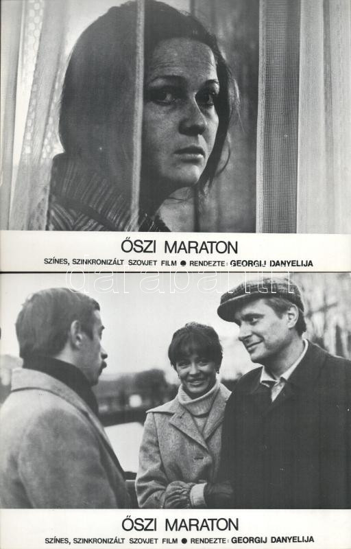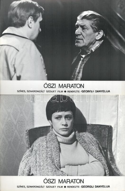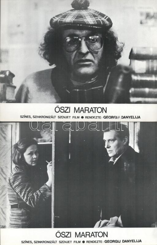 1985 előtti ,,Őszi maraton" című szovjet film jelenetei és szereplői, 11 db produkciós filmfotó (vitrinfotó, lobbyfotó) nyomdatechnikával sokszorosítva kartonpapírra, egyoldalas nyomással, a használatból eredő (esetleges) kisebb hibákkal, 18x24 cm