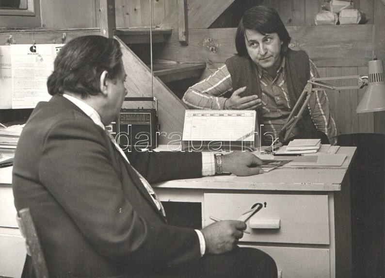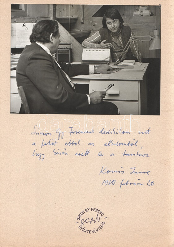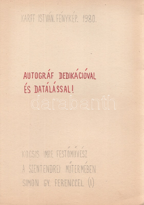 Kocsis Imre (Makó, 1940 - Szentendre, 2015; festő, grafikus) ülő, íróasztali dedikált portréja a vele interjút készítő Simon Gy. Ferenc (1930-2008) kulturális újságíróval a festőművész szentendrei műtermében. Karff István 1980. január 22-i felvétele. Vintázs, zselatinos ezüst nagyítás, mérete: 131x180 mm. A kép egy 305x431 mm-es, félbehajtott kartonlapra ragasztva. Kocsis Imre festőművész a Képzőművészeti Főiskolán tanult, mestere Kmetty János, Kádár György voltak. Pályája elejétől ugyanott tanított. Pop arttal, hiperrealista festészettel foglalkozott, a Makói Grafikai Művésztelep alapítója és szervezője volt. Jelen fotográfiáját dedikálta is: ,,Simon Gy. Ferencnek dedikálom a fotót abból az alkalomból, hogy későn esett le a tantusz. Kocsis Imre, 1980. február 20.'' A fénykép alatt a kartonon Simon Gy. Ferenc kulturális újságíró (Magyar Ifjúság, Képes Újság) gyűjteményi bélyegzésével. Karff István a Hazafias Népfront hivatalos folyóirata, a Képes Újság, valamint mellékkiadványa, a Kis Képes Krónika fotográfusa volt.