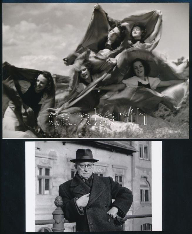 Szöllősy Kálmán (1887-1976) budapesti fényképész és fotóművész időskori portréja (cca 1974) és egy felvétele (cca 1933) szoknyájukat lengető táncos lányokról, 2 db modern nagyítás, jelzés nélkül, 15x21 cm és 10x15 cm