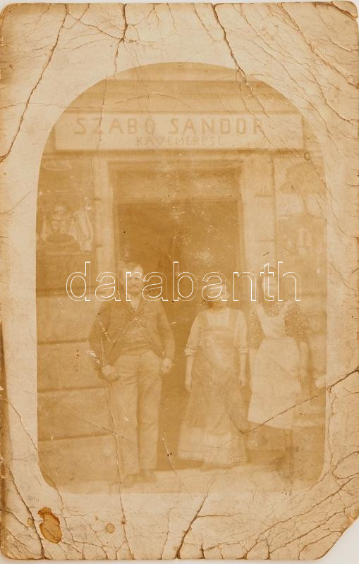 Beschreibung: cca 1900-1920 Szabó Sándor kávémérése (a hátoldali felirat szerint Garai utca 7. szám alatt), sérült fotólap, 13,5x9 cm