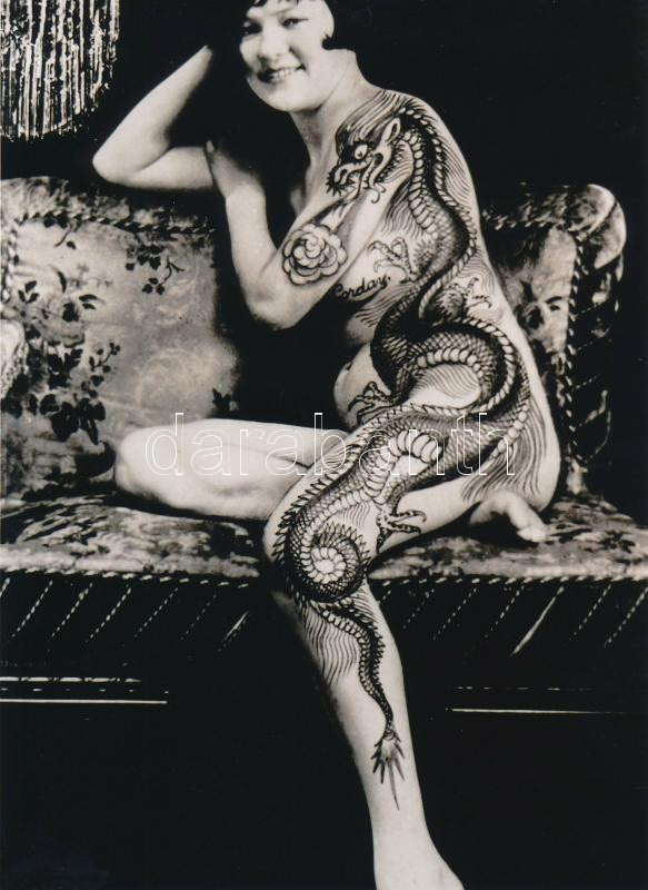 cca 1920 ,,Nem tagadom, sárkány vagyok", egy aktfotóra utólag tetovált, azaz rárajzolt illusztráció", szolidan erotikus felvétel, 1 db modern nagyítás, Corday jelzéssel, ami a rajz része, 21x15 cm