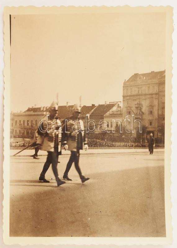 Beschreibung: cca 1940 Kolozsvár, Horthy Miklós kormányzó fogadása október 25-én, testőrök a város főterén, a hátoldalon feliratozott fotó, 8,5x6 cm