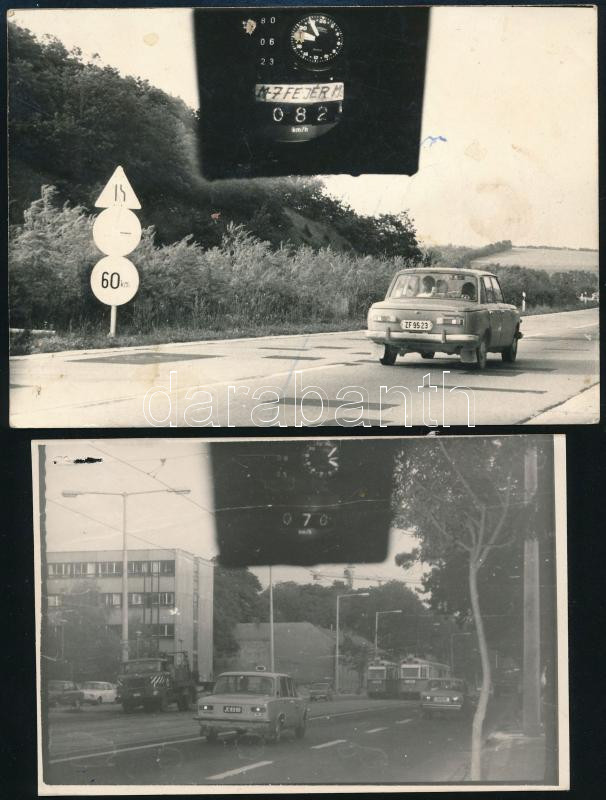 cca 1984 Rendőrségi traffipax felvételek gyorshajtókról, 2 db fotó, az egyik hátoldalán hivatalos feljegyzéssel, kis sérülésekkel, 13x9 cm és 14,5x10,5 cm