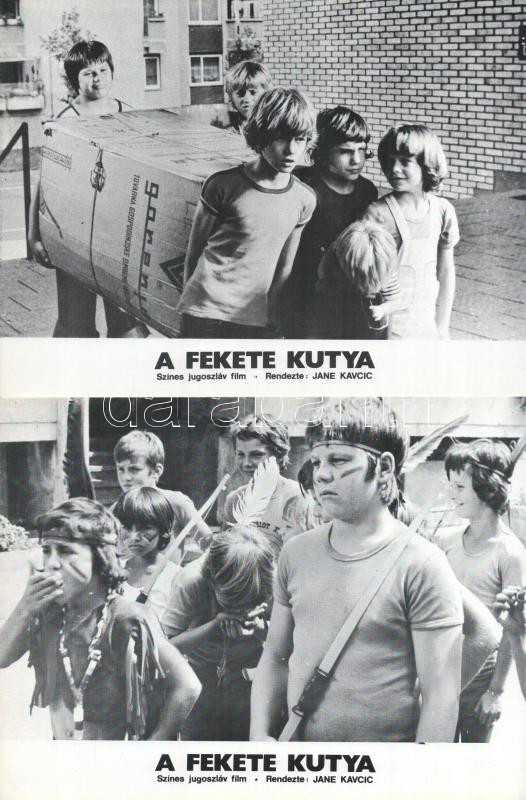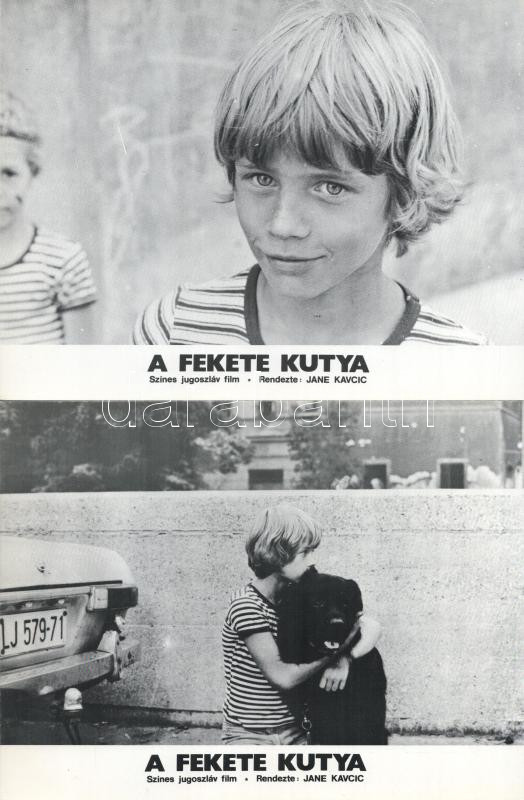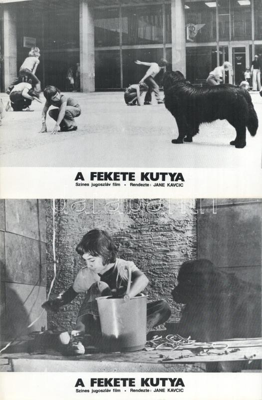 cca 1989 előtti ,,A fekete kutya" című jugoszláv film jelenetei és szereplői, 6 db produkciós filmfotó (vitrinfotó, lobbyfotó) nyomdatechnikával sokszorosítva kartonpapírra, egyoldalas nyomással, a használatból eredő (esetleges) kisebb hibákkal, 18x24 cm