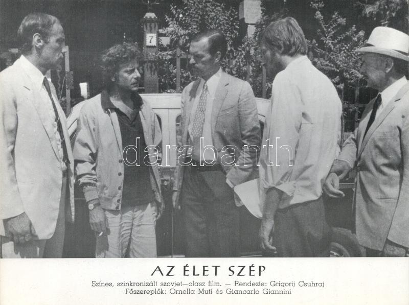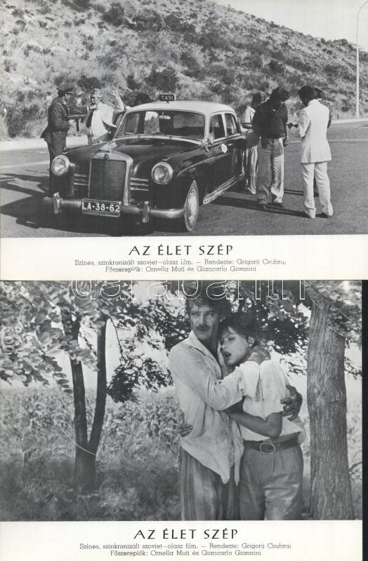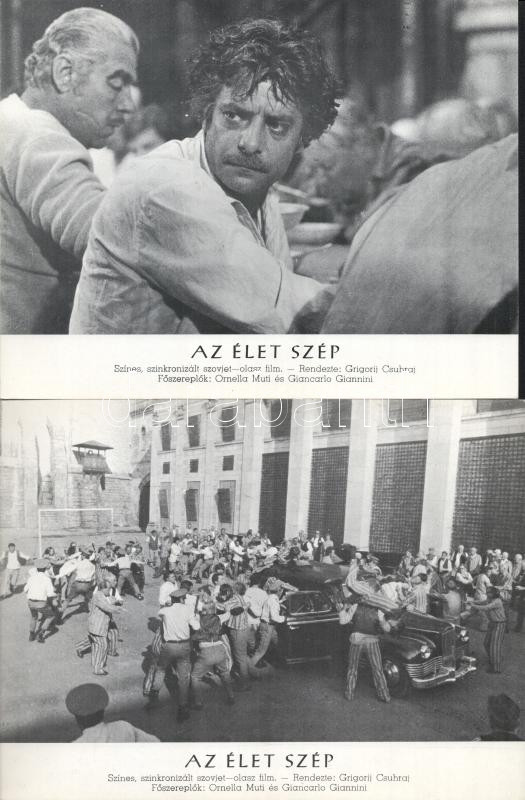cca 1989 előtti ,,Az élet szép" című szovjet - olasz film jelenetei és szereplői, 5 db produkciós filmfotó (vitrinfotó, lobbyfotó) nyomdatechnikával sokszorosítva kartonpapírra, egyoldalas nyomással, a használatból eredő (esetleges) kisebb hibákkal, 18x24 cm