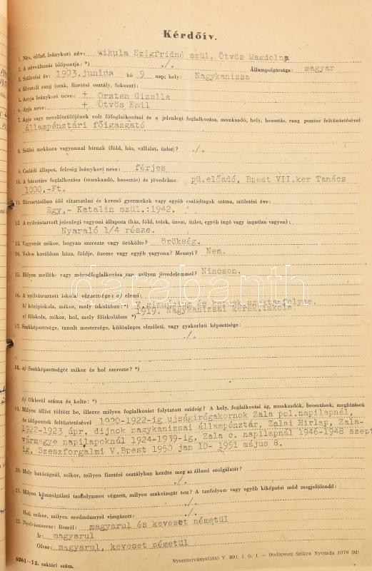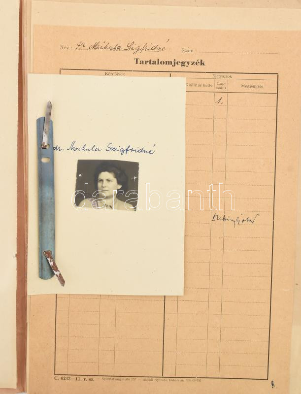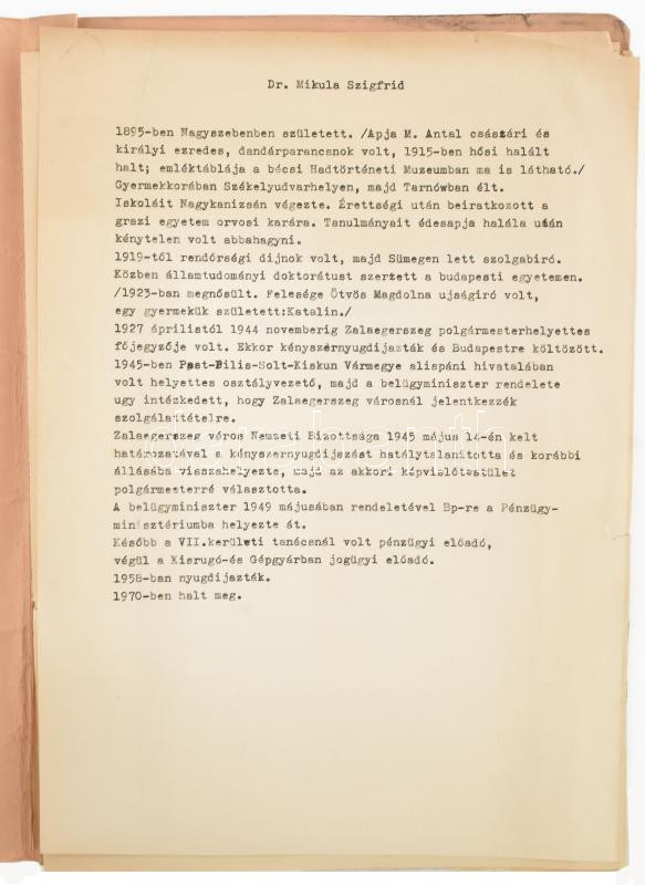 cca 1950-1956 Káderanyag, Dr. Mikula Szigfrid (1895-1970) pénzügyminisztériumi tisztviselő, pénzügyi előadó, korábban Zalaegerszeg polgármestere (1947-1949), valamint felesége, Dr. Mikula Szigfridné (sz. Ötvös Magdolna) vegyes iratai, nyilvántartási lapok, életrajz, stb. Lefűzve, sérült papírmappában.