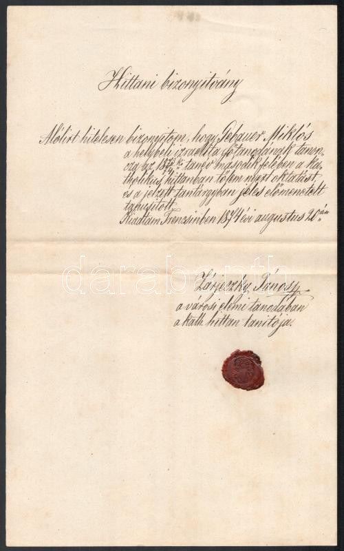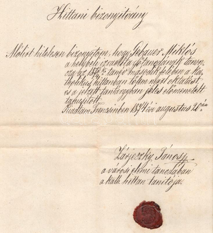1874 Trencséni izraelita főtanoda katolikus hittanára által aláírt via... https://www.darabanth.com/de/466-Fernauktion/466.0/Kunst-Dokumente-andere-Sammelgebiete/Judaica~500005/1874-Trencseni-izraelita-fotanoda-katolikus-hittanara-altal-alairt-viaszpecsetes-bizonyitva~II3148183