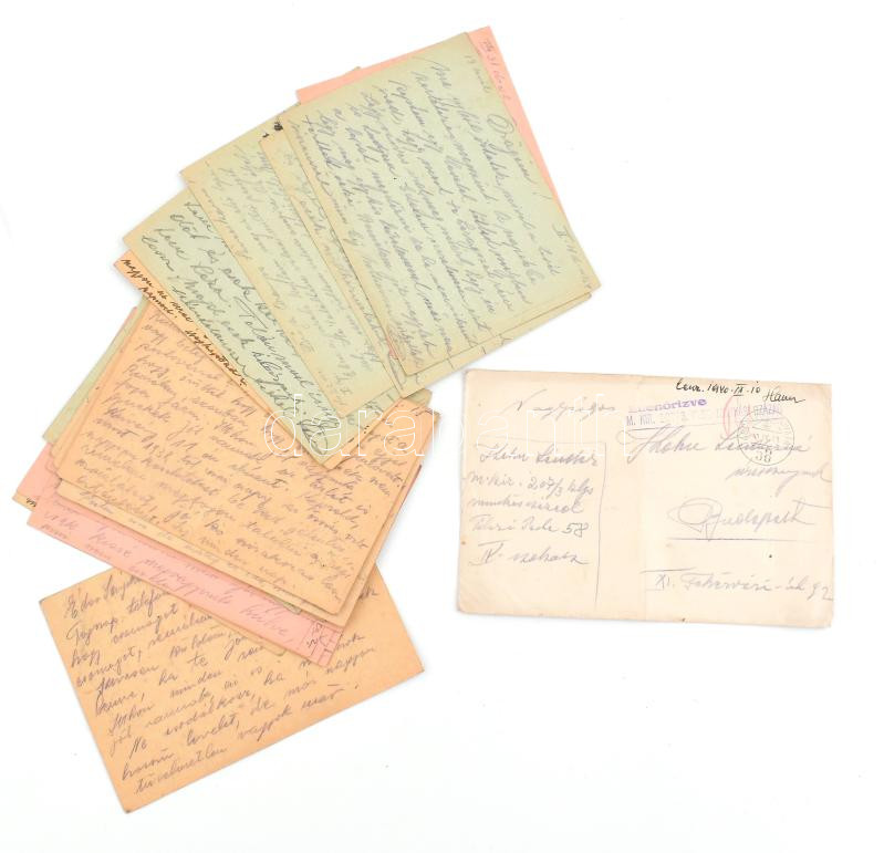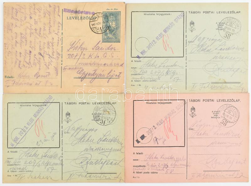 Beschreibung: 1940 M. Kir. 207/3. KLGS Munkás Század pecsétjével ellátott tábori postai levelezőlapok Kohn Sándornénak címezve, 22 db + 1 db boríték