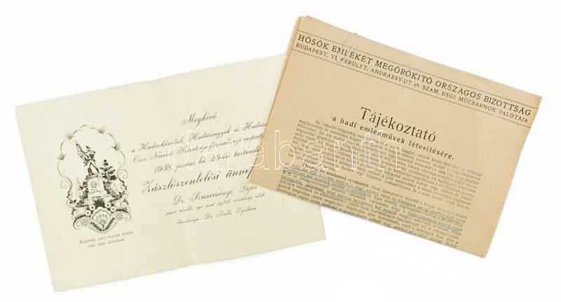 Beschreibung: 1923, 1938 Hősök Emlékét Megörökítő Országos Bizottság tájékoztatója hadi emlékművek létesítésére. + füzesabonyi emlékmű állítására szóló meghívó
