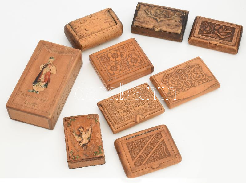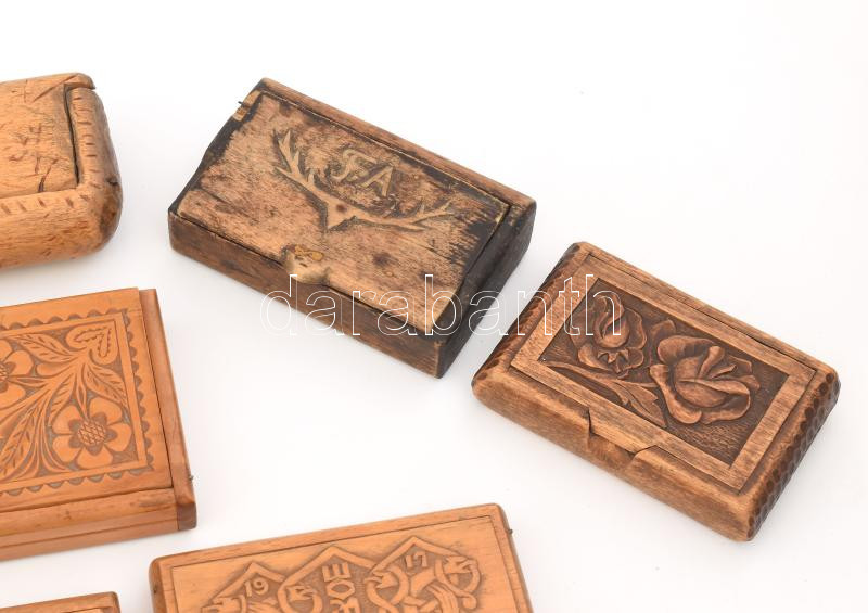 Beschreibung: 9 darab I. világháborús faragott fa díszdoboz. Több darabon felirat, tulajdonos- és helymegjelölés, klf méretben, 1-1 sérüléssel.