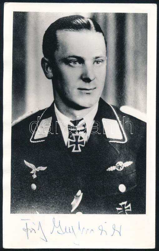 Fritz Tegtmeier (1917-1999) német Luftwaffe pilóta, repülÅ‘ ász (146 légi gyÅ‘zelem), a Vaskereszt Lovagkeresztjének kitüntetettje autográf aláÃrása Å‘t ábrázoló képen (késÅ‘bbi elÅ‘hÃvás), 20x12,5 cm / Autograph signature of Fritz Tegtmeier (1917-1999) German Luftwaffe pilot, flying ace (146 aerial victories), recipient of the Knight's Cross of the Iron Cross, on a photo (later copy), 20x12.5 cm