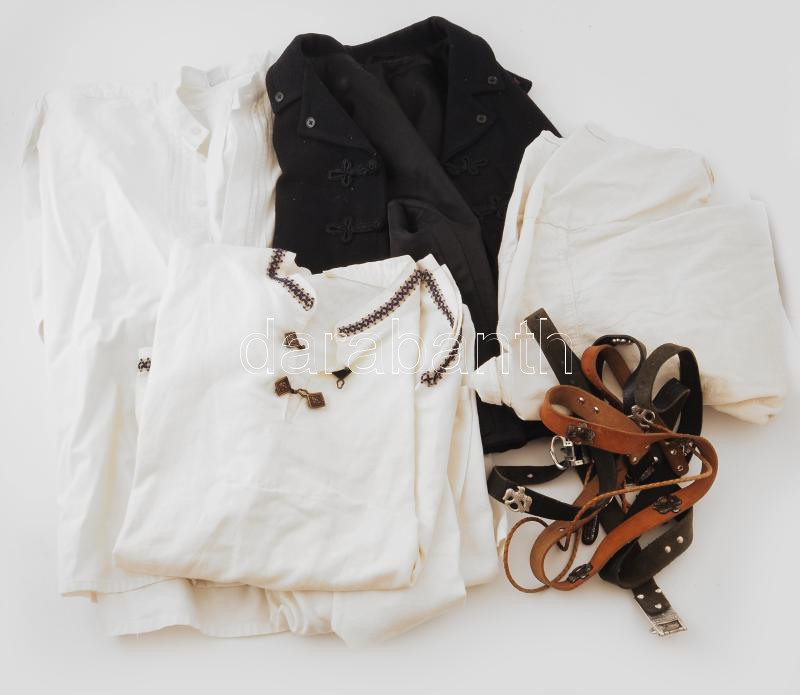 Beschreibung: Hagyományőrző tétel: közte 3 darab ősmagyar motívummal díszített bőr öv, 5 darab hagyományőrző felsőruha.