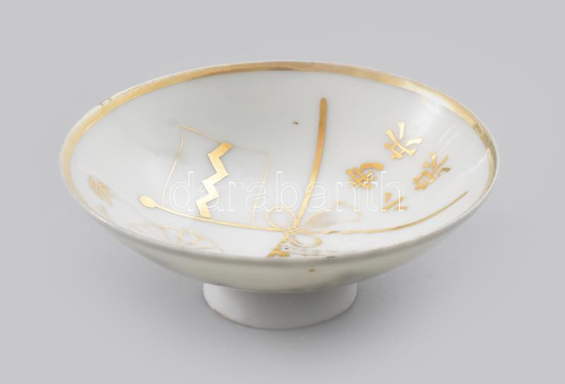 cca 1940-1944, Japán, Katonai szakés csésze. 2. Gyalogos Hadosztály, Koizumi tulajdonosi megjelöléssel. Belsejében páros zászló és krizantém aranyfestett ábrázolással. Minimális kopással, d: 9,5 cm, m: 3,5 cm