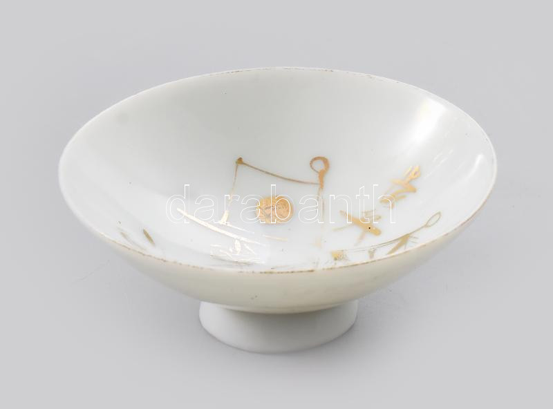Beschreibung: cca 1940-1944, Japán, Katonai szakés csésze. 40. gyalogezred, belsejében páros zászló aranyfestett ábrázolással. Kis kopással, d: 6,5 cm