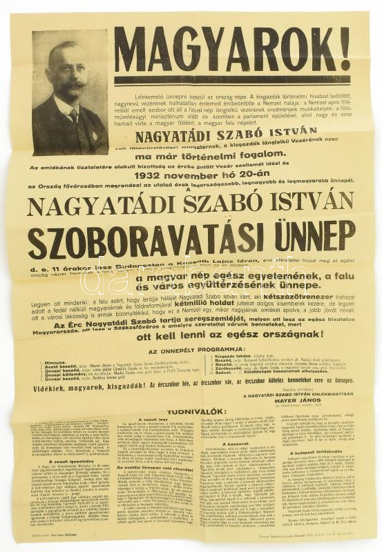 1932 Nagyatádi Szabó István szoboravatási plakát 50x60 cm Hajtva, jó á... https://www.darabanth.com/de/466-Fernauktion/466.0/Kunst-Dokumente-andere-Sammelgebiete/Plakat~500014/1932-Nagyatadi-Szabo-Istvan-szoboravatasi-plakat-50x60-cm-Hajtva-jo-allapotban~II3143140