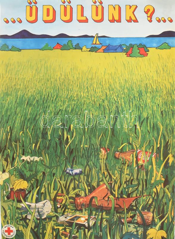 Beschreibung: 1983 Varga Judit (1950- ): "...Üdülünk?...", kiadja: Magyar Vöröskereszt, plakát, feltekerve, gyűrődésekkel, 67x48 cm
