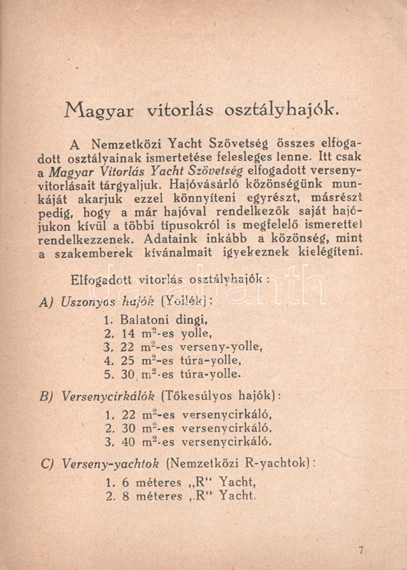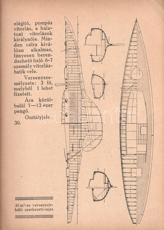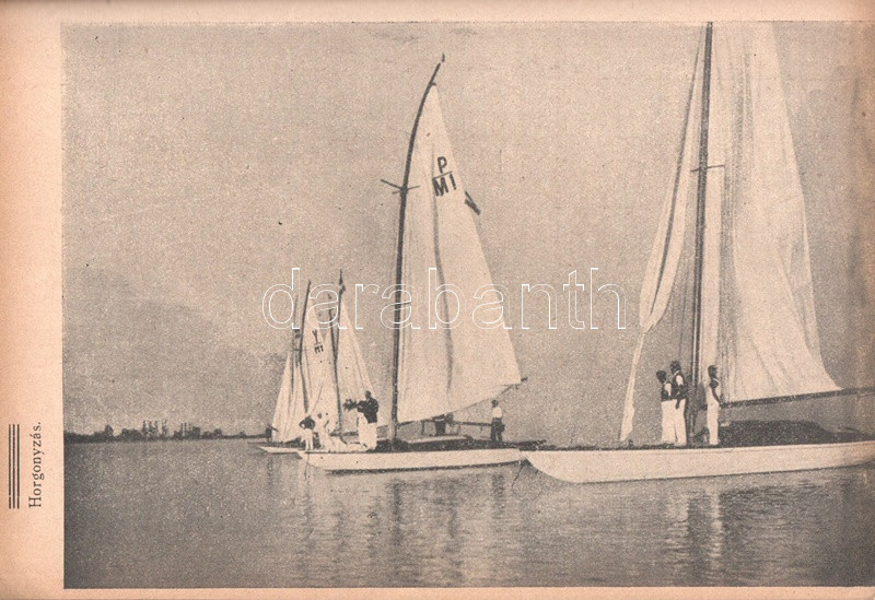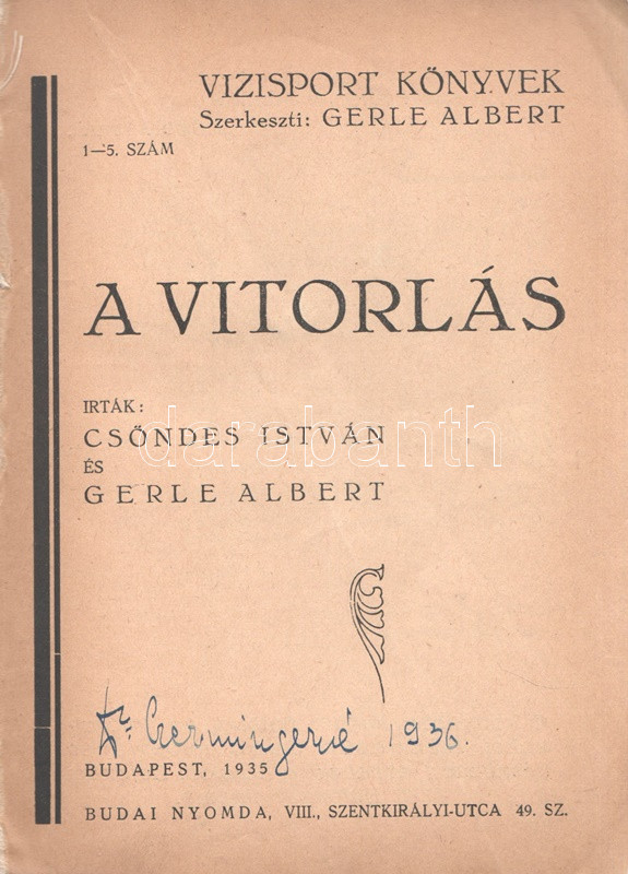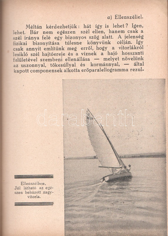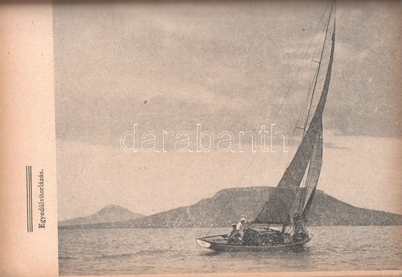 Csöndes István - Gerle Albert: A vitorlás. Budapest, 1935. Budai Nyomda. 136 + [4] p. + 1 táblázat (kihajtható: Balatoni kilométer-táblázat) + 1 térkép (a Balaton színes, kihajtható térképe a Balatonhoz vezető vasutak melléktérképével, hátoldalán ötnyelvű magyarázó szöveggel. Kiadja a M. Kir. Balatoni Intéző Bizottság, tervezte a M. Kir. Állami Térképészet). Egyetlen kiadás. Oldalszámozáson belül 40 egész oldalas és szövegközti fényképpel, ábrával illusztrált. ,,A könyvben látható hajókat és hajórajzokat Benacsek Jenő tervezte és készítette; építette: a Balatoni Hajózási Rt. Hajóépítő üzeme." Példányunk címlapján régi tulajdonosi névbejegyzés, a kötet végén a kihajtható táblázat egyik hajtása mentén berepedt. (Vízisport könyvek, 1-5. szám.) Fűzve, Márton Lajos rajzával illusztrált kiadói borítóban, jó példány.