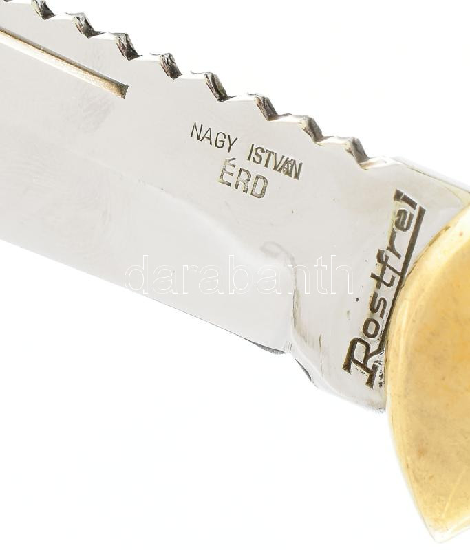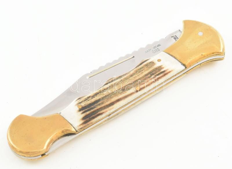 Nagy István Érd, egyedi készítésű, jelzett rugós bicska. Agancs, réz. ... https://www.darabanth.com/de/466-Fernauktion/466.0/Kunst-Dokumente-andere-Sammelgebiete/Waffen-Messer~500008/Nagy-Istvan-Erd-egyedi-keszitesu-jelzett-rugos-bicska-Agancs-rez-Nyitva-25-5-cm-Kival~II3115964