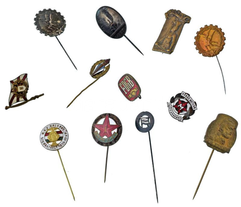 Beschreibung: 12db-os magyar és külföldi jelvénytétel, közte 1966. "MÁV Haladás Szombathely 1896-1966" zománcozott bronz dalos kitűző + ~1970-1980. "Honvédelemért I" zománcozott bronz kitűző T:XF,VF közte tűhiány, zománchiba