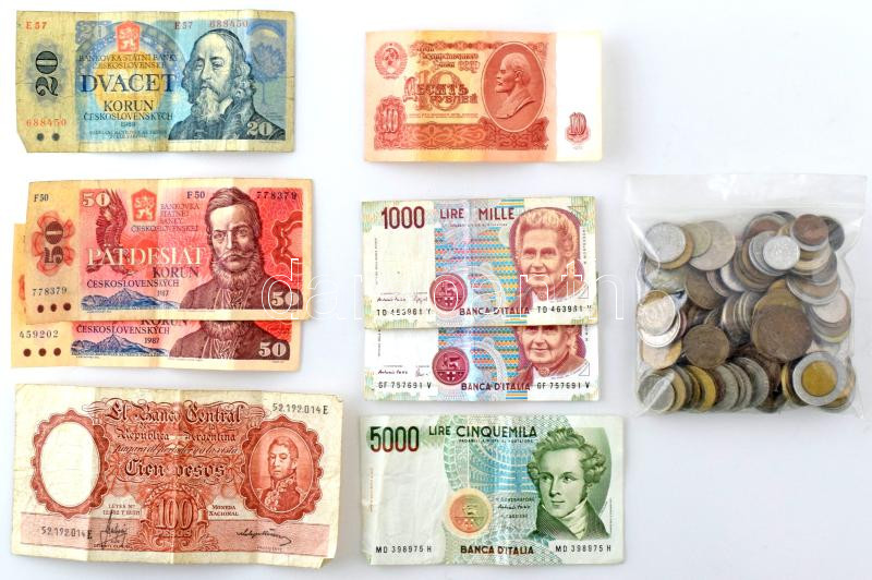 Beschreibung: Kis zacskónyi (~500g) magyar és külföldi érméből + 10db külföldi bankjegyből álló tétel, közte Argentína DN (1966-1967) 100P T:vegyes