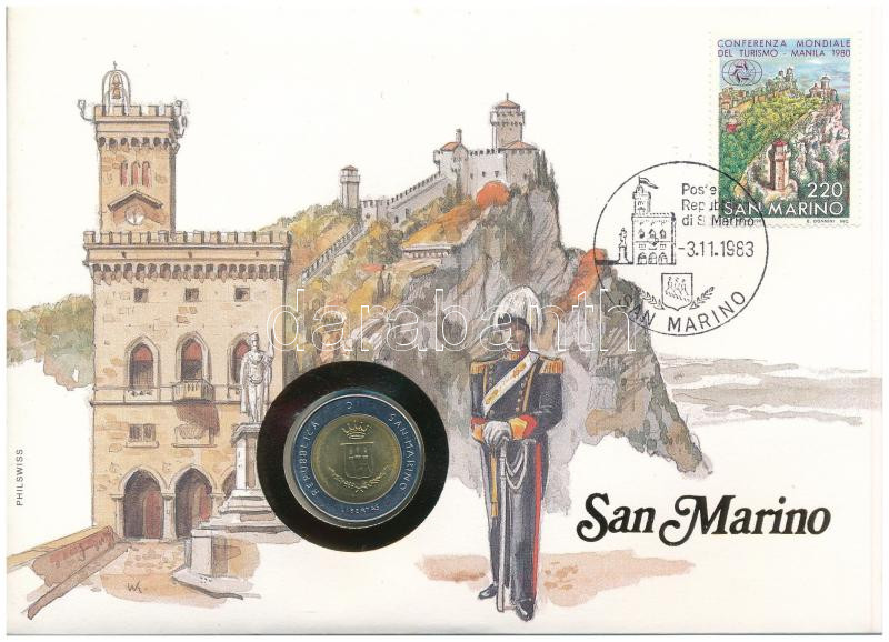 San Marino 1983. 500L bimetál "Az atomháború fenyegetése" felbélyegzett borítékban, bélyegzéssel, német nyelvű leírással T:UNC San Marino 1983. 500 Lire Bimetallic "Threat of Nuclear War" in envelope with stamp, cancellation and a prospectus in german C:UNC
