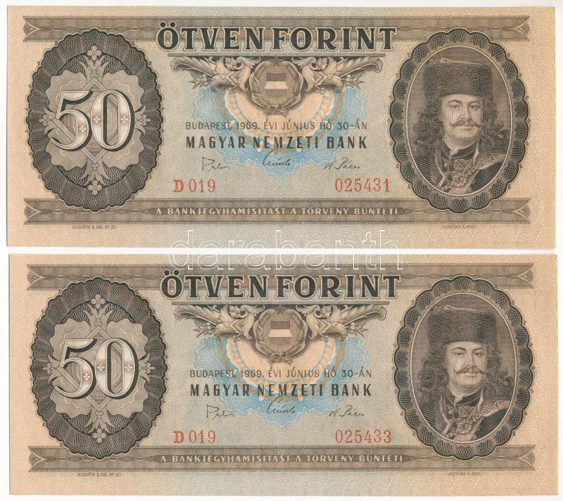 1969. 50Ft (2x) egyugrásos sorszámkövetők "D 019 025431" és "D 019 025... https://www.darabanth.com/de/466-Fernauktion/466.0/Numismatik/Ungarische-Banknoten~1500008/1969-50Ft-2x-egyugrasos-sorszamkovetok-D-019-025431-es-D-019-025433-T-UNC-AUAdamo-F20~II3139759
