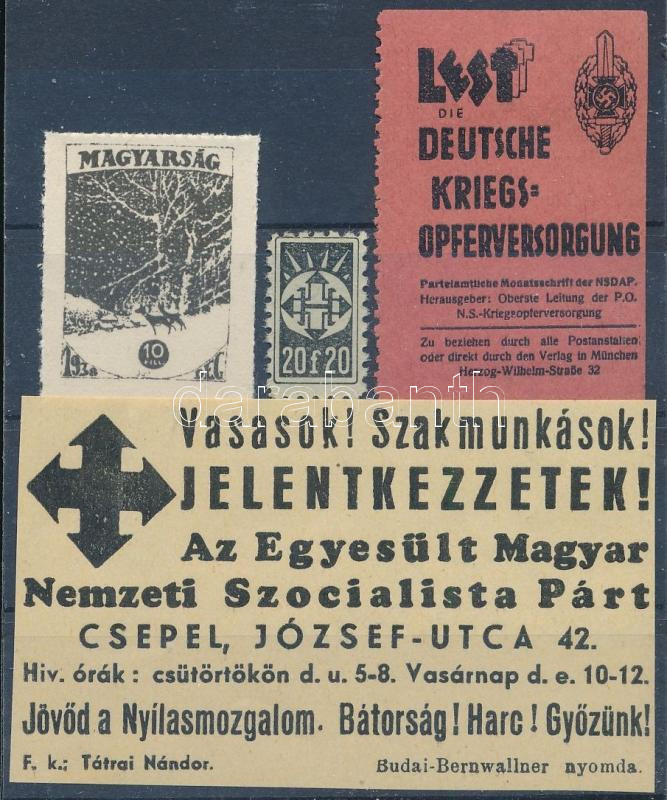 Beschreibung: cca 1939 4 db hungarista és náci levélzáró reklám bélyeg és röplap