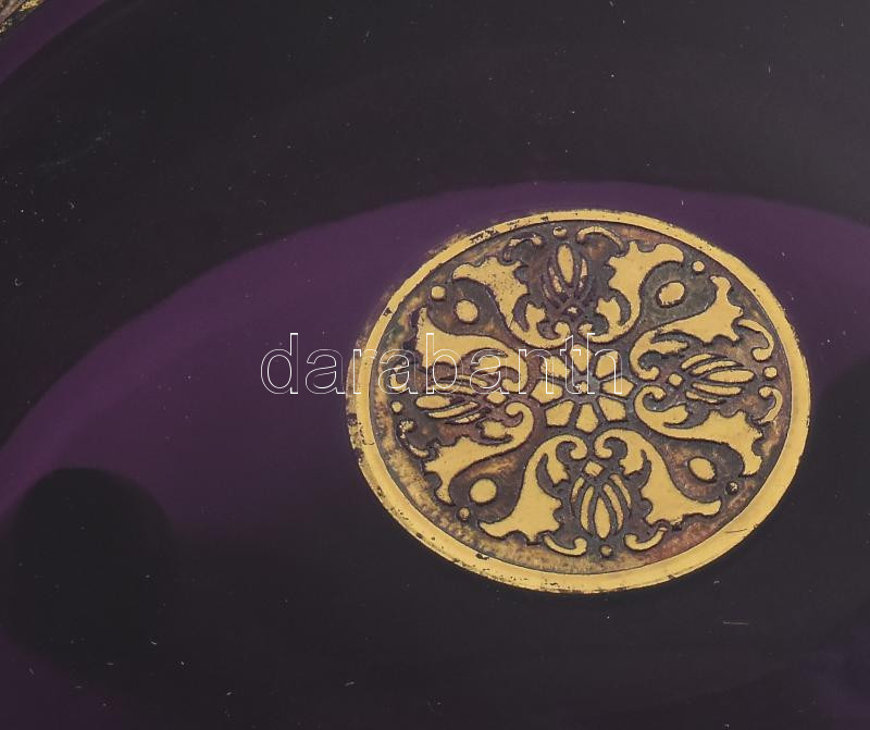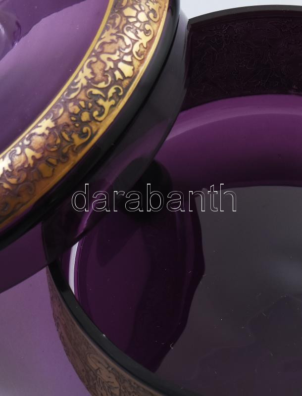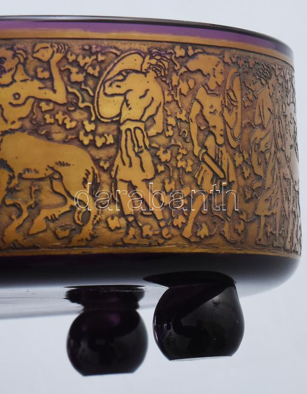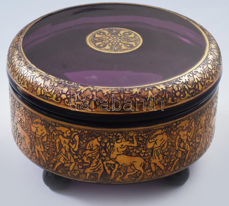 cca 1910/30 Moser Karlsbad ametisztszínű bonbonier, oldalán savmaratott és políraranyozott, kentaur figurákat is magába foglaló harci jelenetet ábrázoló frízzel, fedelén körbefutó virágmintával. Négy csonkolt gömb lábon. Jelzett: kézírással gravírozott "Moser Karlsbad" felirat. Minimális pattogzással, d: 14 cm, m: 8,5 cm