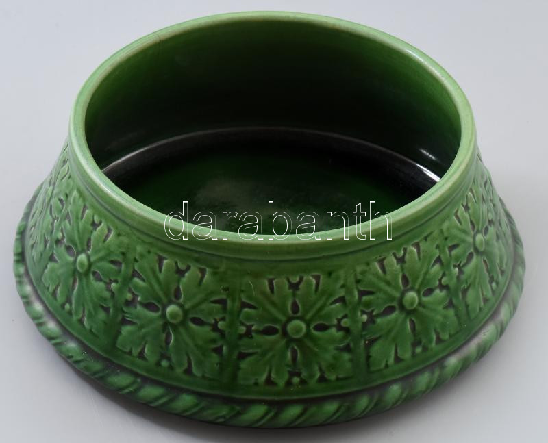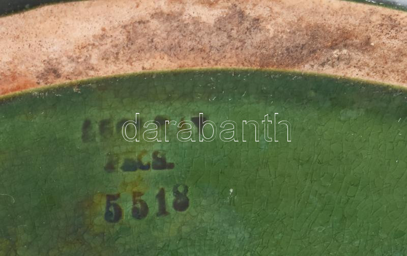 Zsolnay kaspó. Zöld mázzal fedett fehércserép, ismétlődő stilizált levélmintával, 5518 sorszámmal, jelzett, pereménél két mázrepedésből indult repedésvonallal, d: 24 cm, m: 9 cm