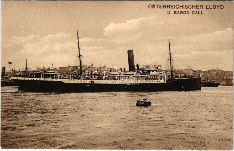Österreichischer Lloyd "D. Baron Call" https://www.darabanth.com/de/467-Fernauktion/467.0/Ansichtskarten/Schiffe~2000048/Osterreichischer-Lloyd-D-Baron-Call~II3151610