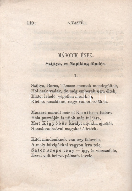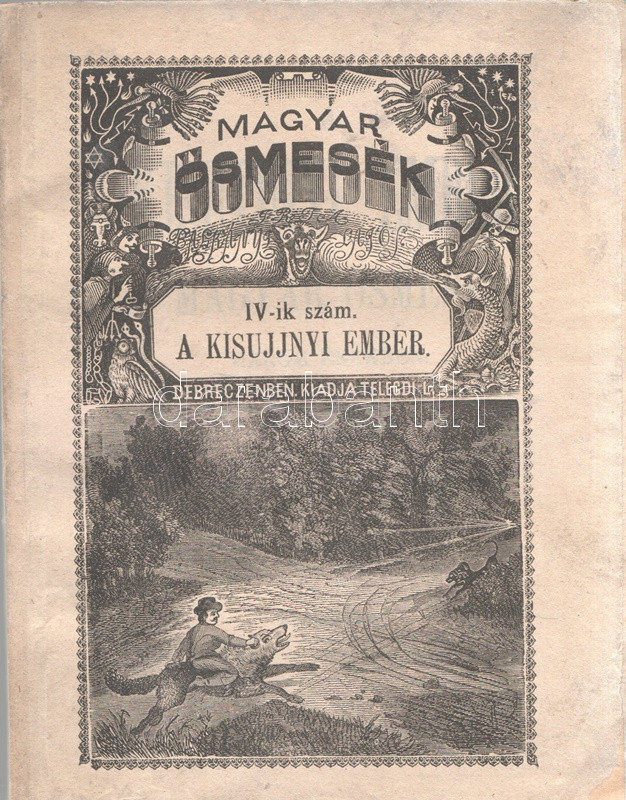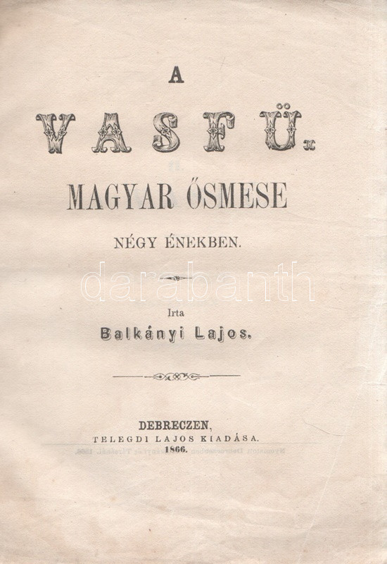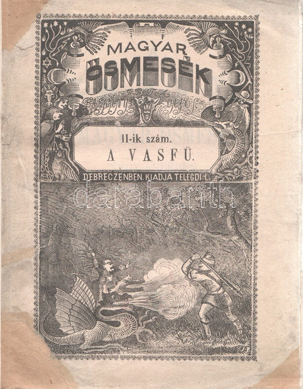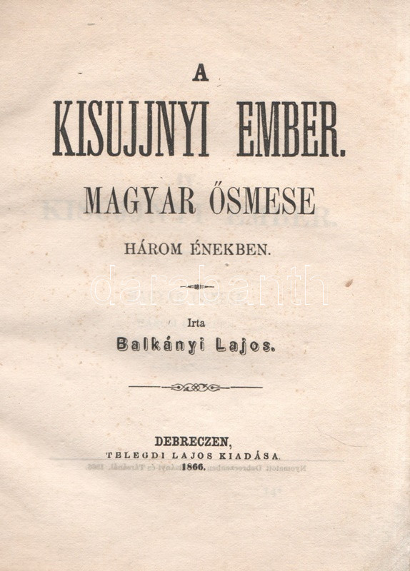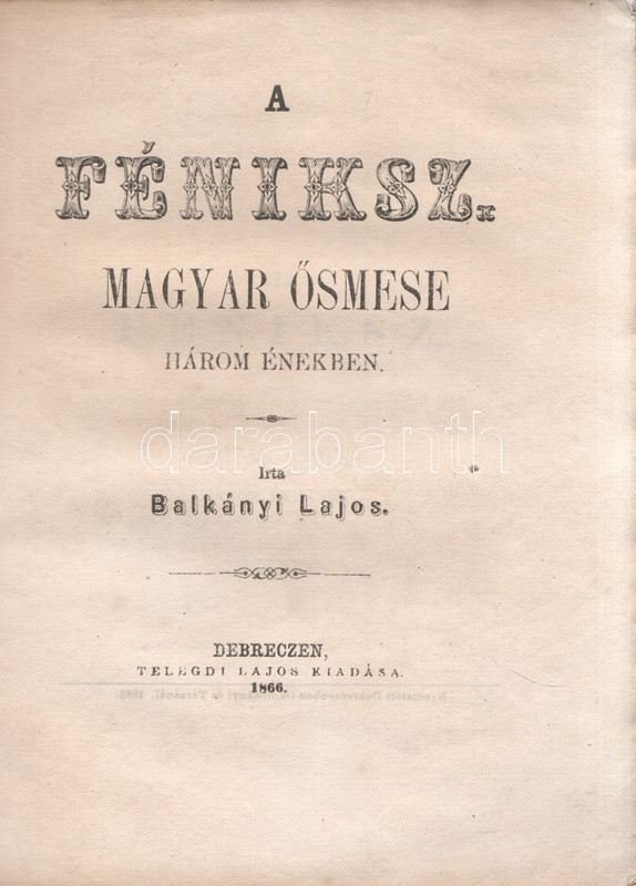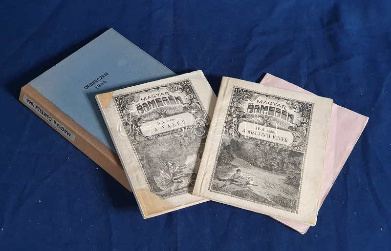 Balkányi Lajos: Magyar ősmesék: A vasfű. Féniksz. A kisujjnyi ember. [Három füzetben.] Debrecen, 1866. Telegdi Lajos kiadása (Nyomatott Debreczenben, Okolitsányi és Társánál). [2] + [91]-160 p.; [2] + [161]-209 + [1] p.; [2] + [211]-259 + [1] p. Balkányi Lajos (1823-1869) ügyvéd, költő, a szabadságharcban nemzetőr szerepet töltött be. Debrecenben fenntartott ügyvédi irodája mellett népies verses elbeszéléseket írt magyar történeti témákban. 1866-ból származó három ősmeséje egy hosszabb sorozat része, mely teljes nevén a ,,Magyar ősmesék, mint hitregék a magyar nép ajkáról véve s a világtörténettel egyeztetve" címet viseli. A magyar őstörténetet feldolgozó népies verses elbeszélések 1860-1875 között jelentek meg Debrecenben, több füzetsorozatban. Az ízes nyelven megfogalmazott őstörténeti elbeszélés cselekménye Ázsiában, közelebbről Perzsiában és Kánaánban játszódik; a szerző a költeményhez fűzött számos etimológiai lábjegyzetben amellett érvel, hogy az ókori névanyag egyes kifejezései a magyar nyelvből érthetők meg, minthogy az ősmagyarságnak a neves ókori civilizációk kialakulásában is szerepe volt. Tételünk az 1866. évi sorozat II., III. és IV. füzetéből áll, a II. és IV. füzet néhány oldalán halvány foltosság. Fűzve, egységes, illusztrált kiadói borítóban (II., illetve IV. füzet), illetve korabeli papírborítóban (III. füzet), XX. század második feléből származó, feliratozott gyűjtőmappában. A II. füzet első borítója javított, hátsó borítója hiányzik. Jó példány.