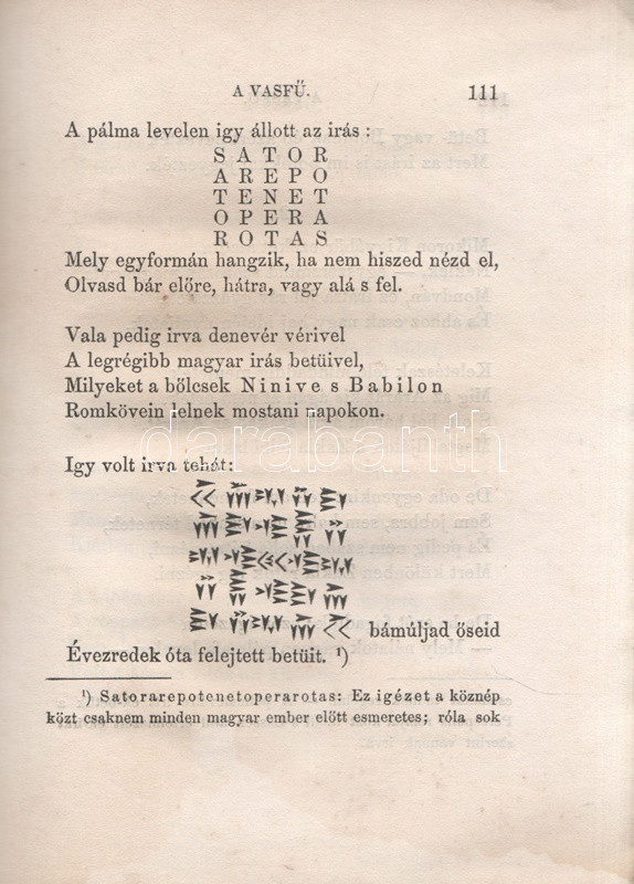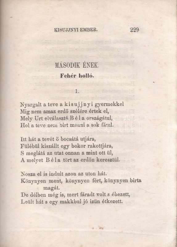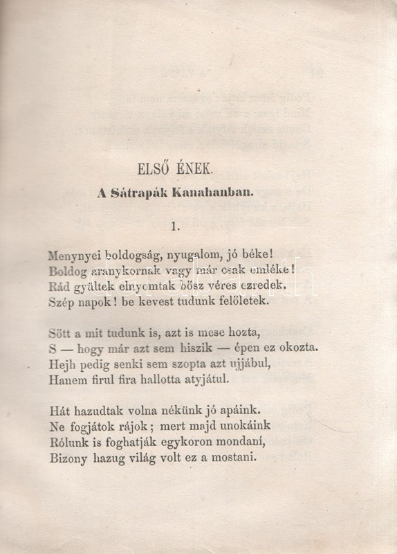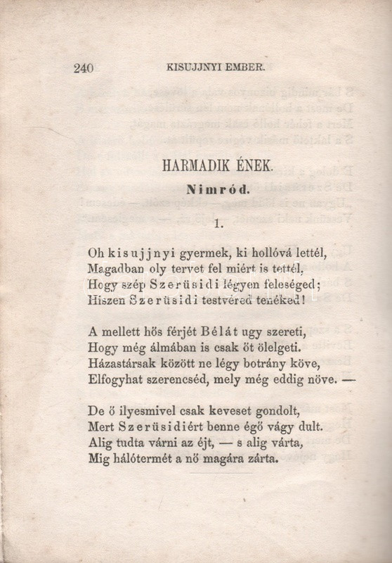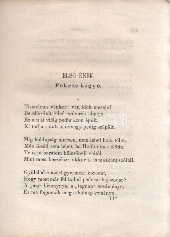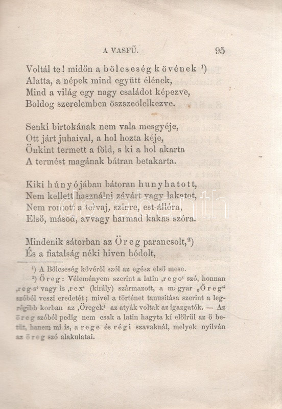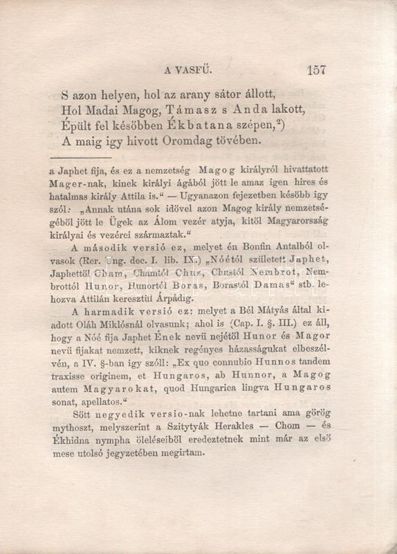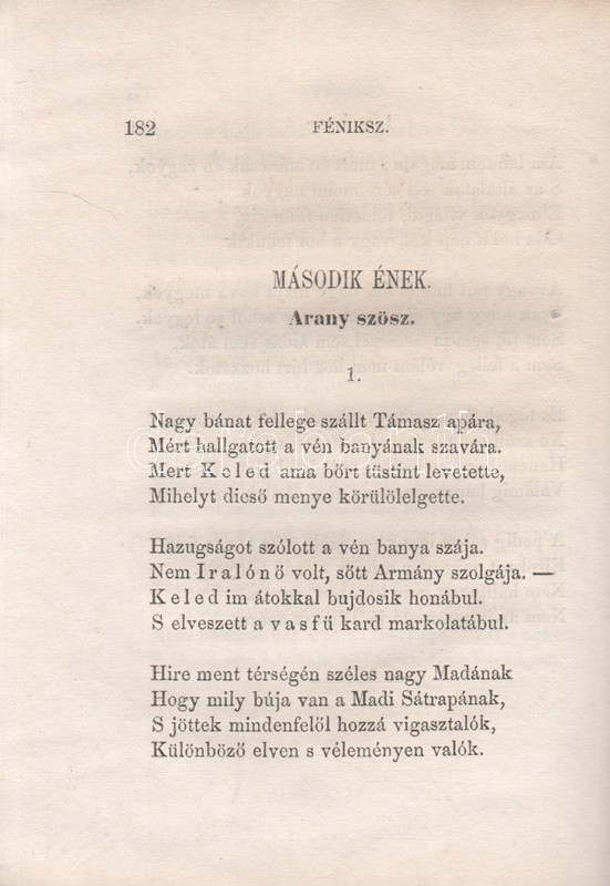 Balkányi Lajos: Magyar ősmesék: A vasfű. Féniksz. A kisujjnyi ember. [Három füzetben.] Debrecen, 1866. Telegdi Lajos kiadása (Nyomatott Debreczenben, Okolitsányi és Társánál). [2] + [91]-160 p.; [2] + [161]-209 + [1] p.; [2] + [211]-259 + [1] p. Balkányi Lajos (1823-1869) ügyvéd, költő, a szabadságharcban nemzetőr szerepet töltött be. Debrecenben fenntartott ügyvédi irodája mellett népies verses elbeszéléseket írt magyar történeti témákban. 1866-ból származó három ősmeséje egy hosszabb sorozat része, mely teljes nevén a ,,Magyar ősmesék, mint hitregék a magyar nép ajkáról véve s a világtörténettel egyeztetve" címet viseli. A magyar őstörténetet feldolgozó népies verses elbeszélések 1860-1875 között jelentek meg Debrecenben, több füzetsorozatban. Az ízes nyelven megfogalmazott őstörténeti elbeszélés cselekménye Ázsiában, közelebbről Perzsiában és Kánaánban játszódik; a szerző a költeményhez fűzött számos etimológiai lábjegyzetben amellett érvel, hogy az ókori névanyag egyes kifejezései a magyar nyelvből érthetők meg, minthogy az ősmagyarságnak a neves ókori civilizációk kialakulásában is szerepe volt. Tételünk az 1866. évi sorozat II., III. és IV. füzetéből áll, a II. és IV. füzet néhány oldalán halvány foltosság. Fűzve, egységes, illusztrált kiadói borítóban (II., illetve IV. füzet), illetve korabeli papírborítóban (III. füzet), XX. század második feléből származó, feliratozott gyűjtőmappában. A II. füzet első borítója javított, hátsó borítója hiányzik. Jó példány.