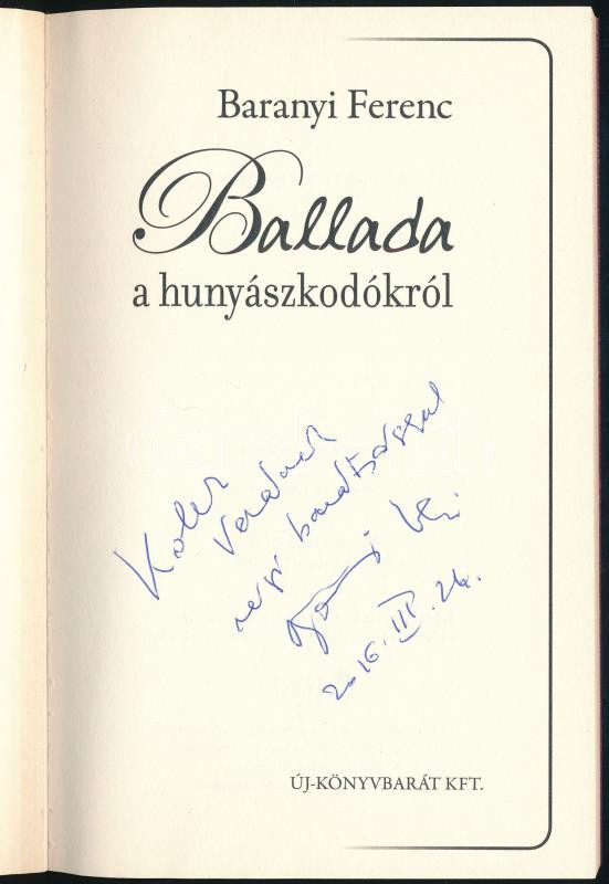 Baranyi Ferenc: Ballada a hunyászkodókról. Bp., 2015, Új-Könyvbarát. A szerző, Baranyi Ferenc (1937-) Kossuth- és József Attila-díjas költő, író által Kolek Vera újságíró, a rádió riportere részére DEDIKÁLT! Kiadói papírkötés.