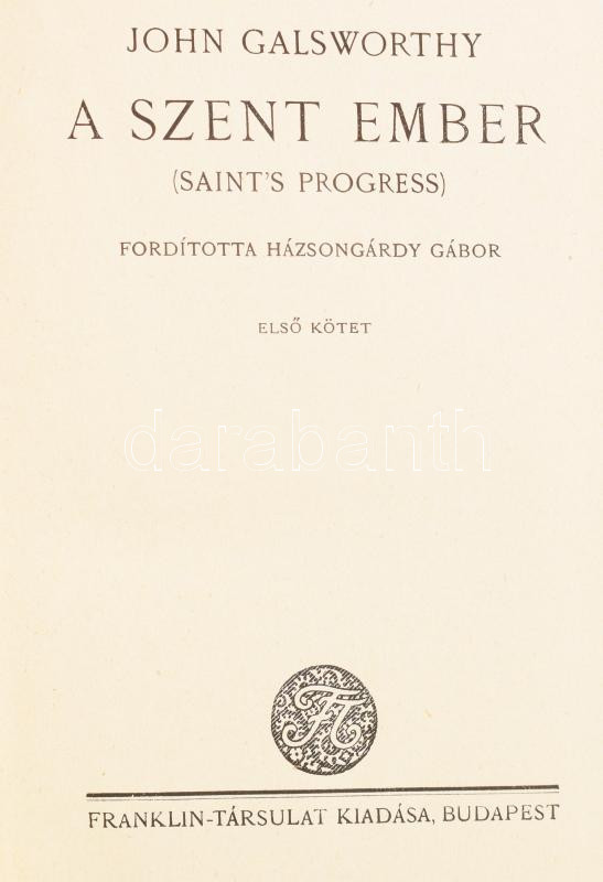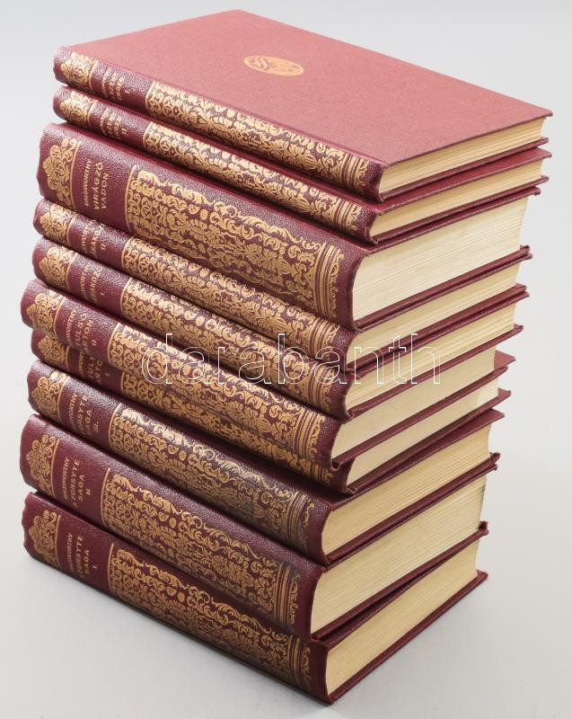 John Glasworthy műveinek 10 kötete (5 cím). Közte: A Forsyte saga I-III, A tulsó parton I-II, A várakozó I-II, A szent ember I-II, Virágzó vadon. Külföldi Regényírók sorozat. Bp., én., Franklin. Kiadói aranyozott egészvászon sorozatkötés, kis kopásnyomokkal.