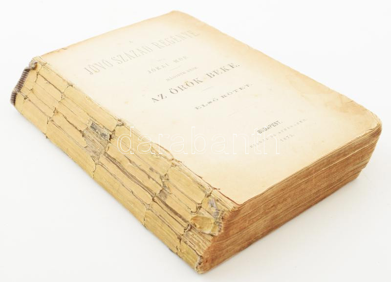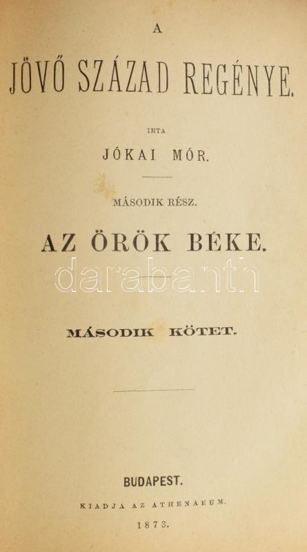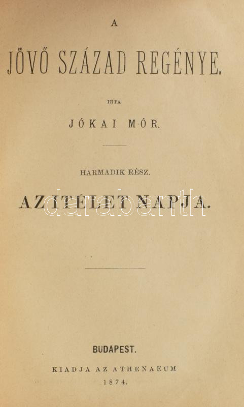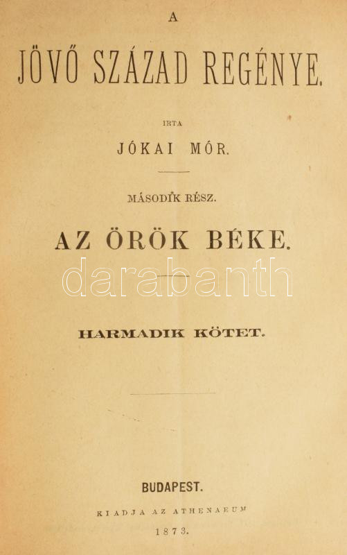 Jókai Mór: A jövő század regénye. II-III. rész. II. rész: Az örök béke I-III. kötet. III. rész: Az ítélet napja. Bp., 1873-1874, Athenaeum, 160+1 p.;154 p.; 154+1 p.; 130+2 p. Első kiadás. Borító nélküli példány, a hátsó szennylap meg van,de foltos.