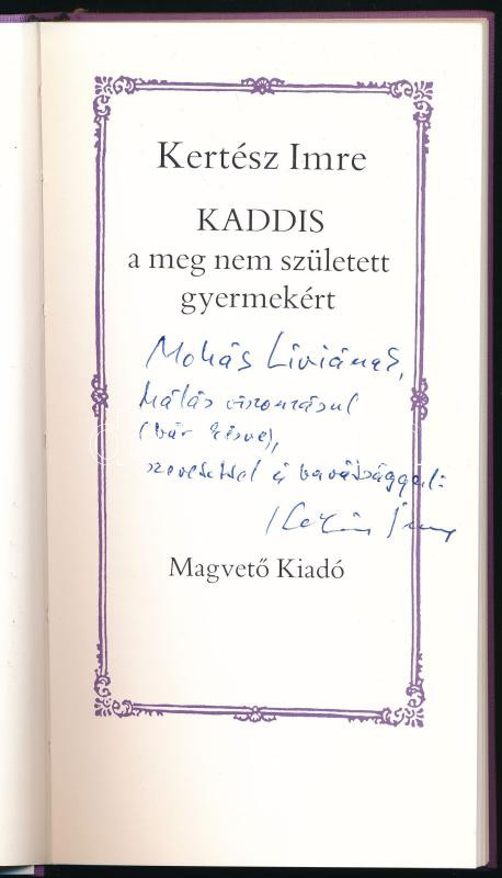 Kertész Imre: Kaddis a meg nem született gyermekért. A szerző, Kertész Imre (1929-2016) Nobel- és Kossuth-díjas magyar író által Mohás Lívia (1928-2024) pszichológus, József Attila-díjas író részére DEDIKÁLT példány! Bp., 1990, Magvető, 195+1 p. Első kiadás. Kiadói egészvászon-kötés.