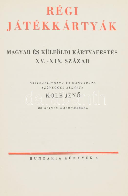Régi játékkártyák. Magyar és külföldi kártyafestés XV-XIX. század. Összeáll.: Kolb Jenő. Bp., 1984, Állami Könyvterjesztő Vállalat. AZ 1939-es kiadás reprintje. Kiadói egészvászon-kötés.