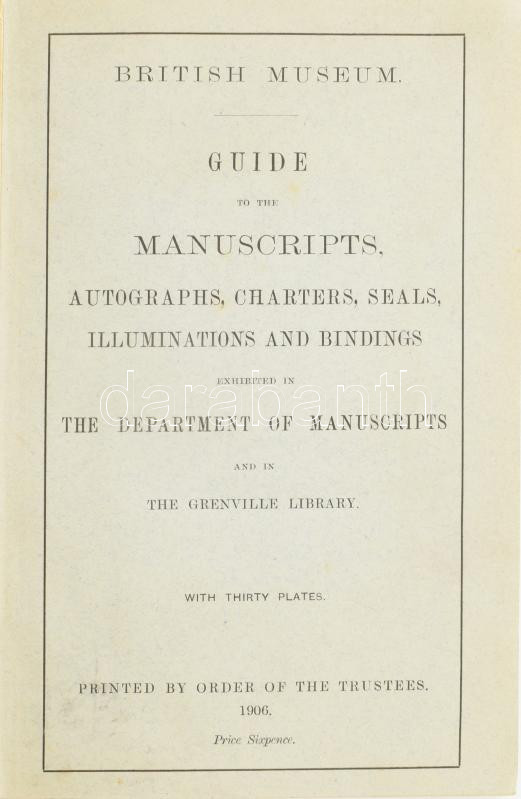 A British Museum kéziratgyűjteményének katalógusa - Guide to the Manuscripts, Autographs, Charters, Seals, Illuminations and Bindings exhibited in the Department of manuscripts and in the Grenville Library. Oxford, 1906. British Museum.