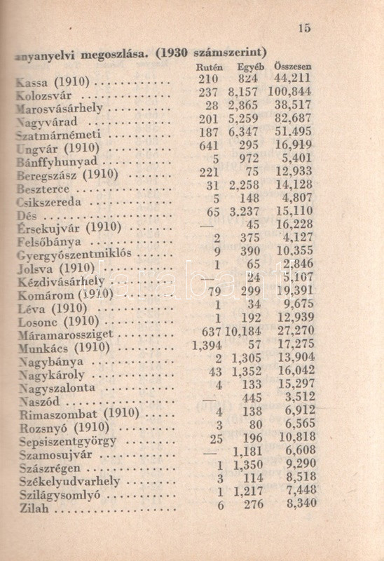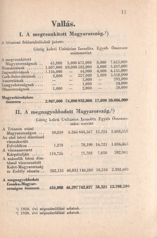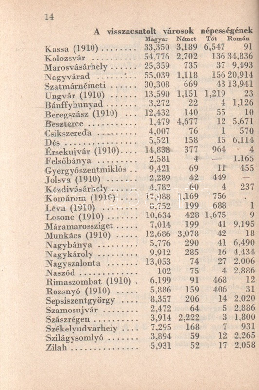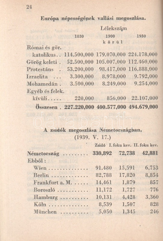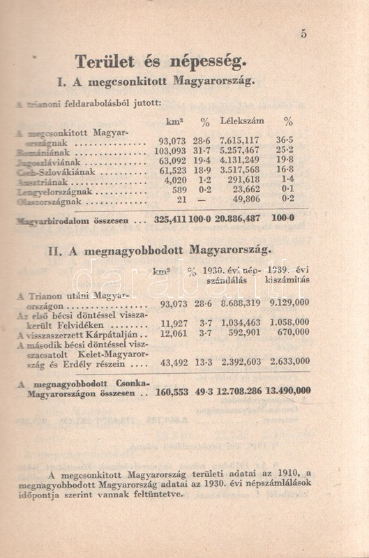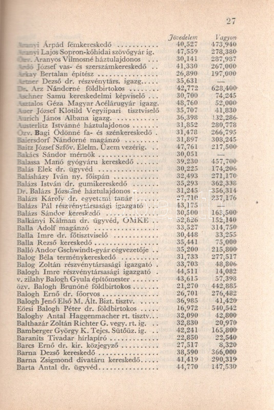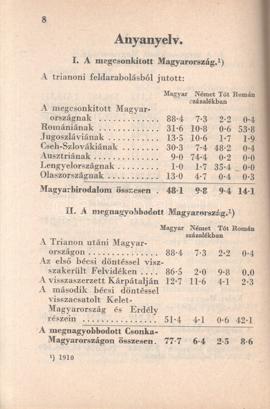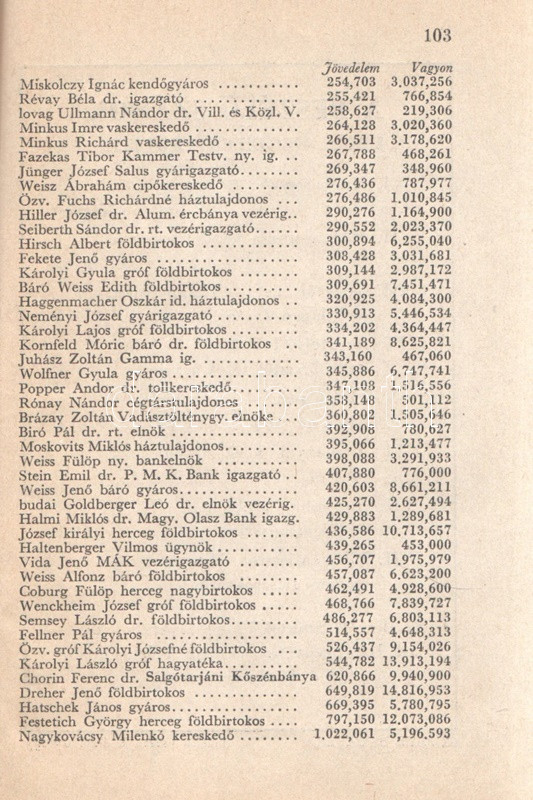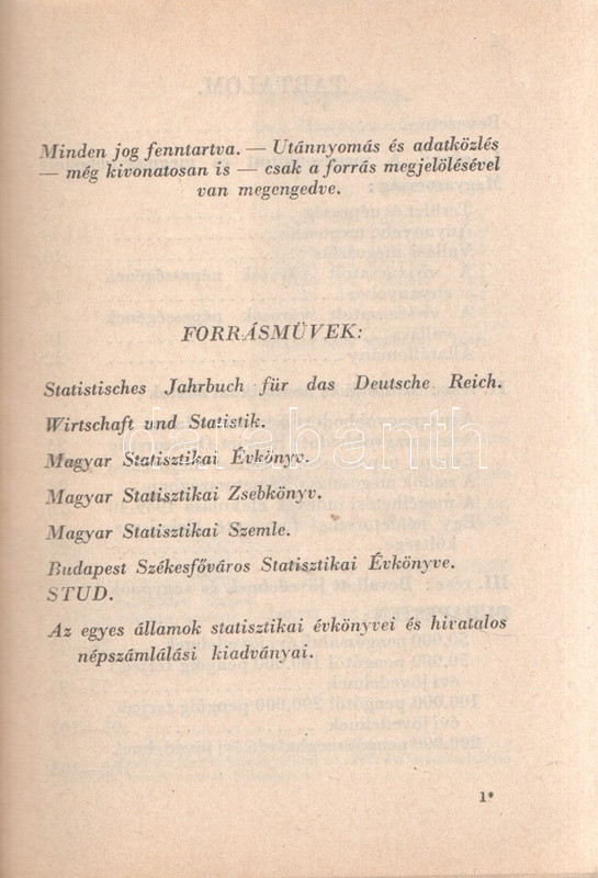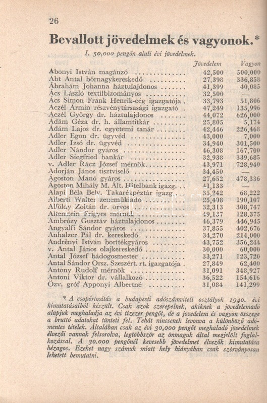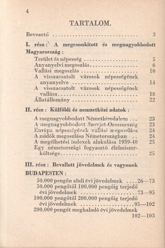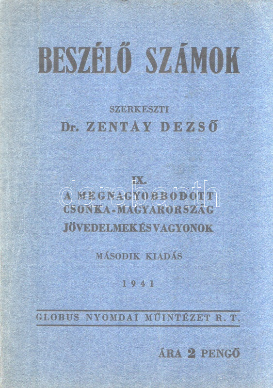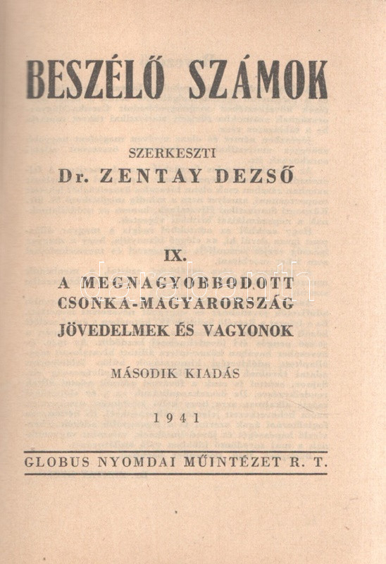 Beszélő számok IX.: A megnagyobbodott Csonka-Magyarország: Jövedelmek és vagyonok. (Budapest), 1941. Globus Nyomdai Műintézet Rt. 104 p. A ,,Beszélő számok" címmel megjelenő statisztikai évkönyvsorozat köteteit Zentay Dezső (1888-1945) statisztikus, a Központi Statisztikai Hivatal munkatársa, későbbi elnöke állította össze. A kötet elején a Felvidék egy részét visszajuttató első bécsi döntés (1938), a kárpátaljai bevonulás (1939) és az Észak-Erdélyt visszajuttató második bécsi döntés (1940) nyomán kibővült Magyarország nyelvi, vallási és gazdasági mutatóinak változását mutató rész. A munka zömét a legjelentősebb budapesti adófizetők listája alkotja, a név, a foglalkozás, a bevallott jövedelem és vagyon feltüntetésével. A lista az évi 30,000 pengőn felüli jövedelemmel bíró budapesti adózók társadalomtörténetileg is érdekes lajstroma: szerepelnek itt háztulajdonosok, papírkereskedők, kalapkereskedők, szállodabérlők, litográfusok, gyártulajdonosok, földbirtokosok, orvosok, ügyvédek, politikusok, sütőmesterek, kávésok, korcsmárosok és mulató-tulajdonosok, haszonélvezők, színésznők és szifonfej-öntők; elvétve egyetemi tanárok is. (Az előszóban a szerkesztő megjegyzi, hogy a kiadványt tanulságos összevetni a Beszélő számok IV. kötetével, mely ugyancsak a legnagyobb budapesti adózók listáját nyújtja.) Példányunk az azonos évben megjelenő második kiadásból származik. Fűzve, kiadói borítóban. Jó példány.