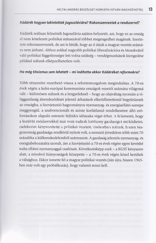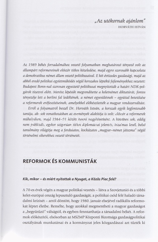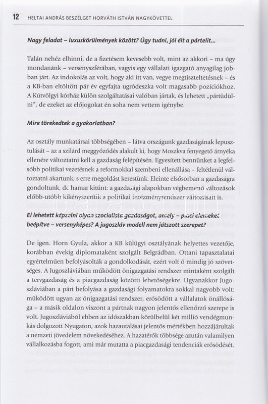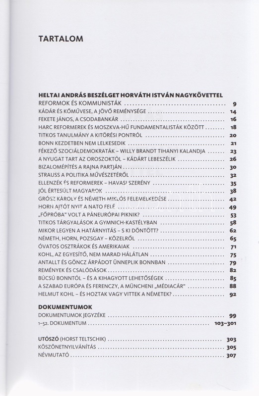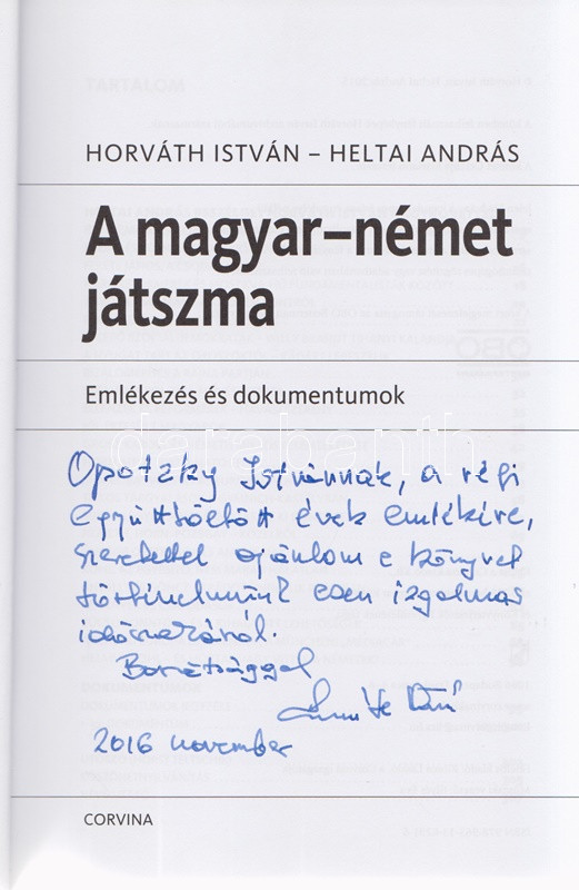 Horváth István - Heltai András: A magyar-német játszma. Emlékezés és dokumentumok. (Dedikált.) (Budapest, 2015). Corvina Kiadó (Szekszárdi Nyomda Kft.) 311 + [1] p. + 12 t. (kétoldalas). Egyetlen kiadás. Dedikált: ,,Opotzky Istvánnak, a régi együtt töltött évek emlékére; szeretettel ajánlom e könyvet történelmünk ezen izgalmas időszakáról. Barátsággal, Horváth István. 2016 november''. Horváth István (sz. 1943) közgazdász, külkereskedő, bonni nagykövet 1984-1991 között. A volt nagykövettel készített nagyinterjú a rendszerváltozáshoz vezető folyamatot a maga gazdaságpolitikai, belpolitikai és diplomáciai összetettségében érzékelteti. Kötetünk második része számos ,,szigorúan titkos'' besorolású levelet közöl, melyek a szovjet szövetségi rendszerben élő, de gazdasági válságba jutott Magyarország óvatos nyugati nyitásának témájában születtek, de kiemelt érdekességűnek mondható a rendszerváltást közvetlenül megelőző, belpolitikai természetű Antall József-Grósz Károly levélváltás is. Prov.: Opotzky István, a bonni magyar nagykövetség főszakácsa. Kiadói kartonkötésben, színes, illusztrált kiadói védőborítóban. Jó példány.