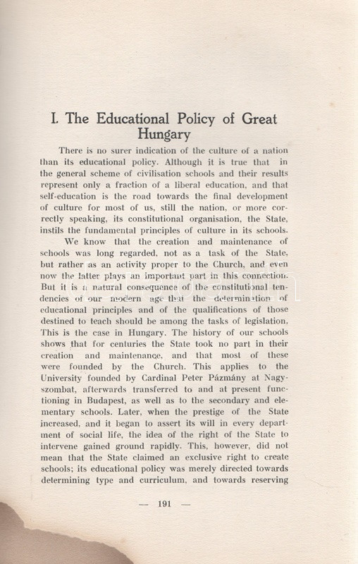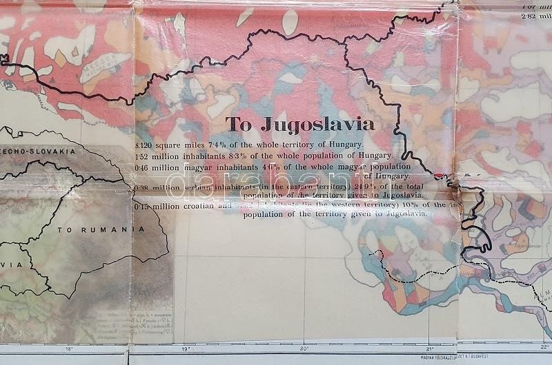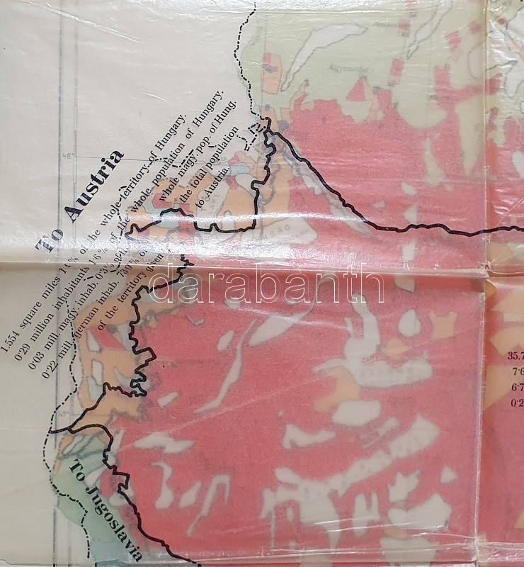 Justice for Hungary. Review and Criticism of the Effect of the Treaty of Trianon. By Albert Apponyi, Albert Berzeviczy, Oliver Eöttevényi, Francis Fodor, Béla Földes, Eugene Horváth, George Lukács, Emil Nagy, Julius Wlassics. Ethnographic Map of Hungary by Paul Teleki. London, 1928. Longman, Green and Co. Ltd. (Printed by Budapesti Hirlap Ltd.) [6] + 376 p. + 1 térkép (feliratozott hártyapapírral védett színes térkép). A kilencszerzős tanulmánykötet a trianoni békediktátumhoz vezető háborús, belpolitikai és diplomáciai tényezőkről írt hosszabb tanulmány után részletesen elemzi a történelmi Magyarország utolsó néhány évtizedének oktatás- és kultúrpolitikáját - mely a gyakori vádakkal szemben (és az utódállamok gyakorlatával szemben) a nemzetiségek számára kulturális lehetőségeket is biztosított, a nyelvhasználati jogokat nem korlátozta, és nem törekedett minden erővel a lakosság kulturális homogenizálására. A tanulmánykötet számba veszi az utódállamok magyarsággal kapcsolatos nemzetiségi politikáját, mely politikában nem megy ritkaságszámba az állampolgári jogoktól való megfosztás sem. A kötet gazdaságpolitikai tanulmánya a Kárpát-medence gazdaságának természetes egységéről és régiónak egymásra utaltságáról értekezik. Példányunk melléklete Teleki Pál két nyelven, magyar és angol nyelven feliratozott nevezetes etnográfiai térképe, az úgynevezett vörös térkép, mely a döntően magyar lakta területeket vörös színnel jelzi, a román lakta vidékeket lila, a szlovák vidékeket világoszöld, a ruszinokat sötétzöld, a németeket narancs, a horvátokat világoskék, a szerbeket sötétkék színnel jelzi, a számottevő lakatlan vidékeket pedig - melyek színnel való kitöltése a manipuláció melegágya - színezetlenül hagyja. 1: 1,000,000 mértékű színes térképünk a Magyar Földrajzi Intézetben készült, az 1910-es népszámlálás adatai alapján, mérete: 570x780 mm egy 630x855 mm méretű térképlapon, a bal alsó sarokban a Kárpát-medence hegy- és vízrajzát ábrázoló melléktérképpel, a jobb felső sarokban magyarázó szöveggel. Térképünk egyediségét a hozzá kapcsolódó, feliratozott, az új határvonalakat angol nyelvű, szöveges kommentárral ellátó hártyapapír biztosítja. Térképünkön a hajtások mentén kisebb szakadások, apróbb foltosság. A tanulmánykötet levelein alul, a szövegtükör alatt kisebb foltosság, a címoldalon, illetve a térképlapon és hártyapapírján régi tulajdonosi bejegyzés. Aranyozott gerincű, foltos kiadói egészvászon kötésben. Körülvágatlan példány.