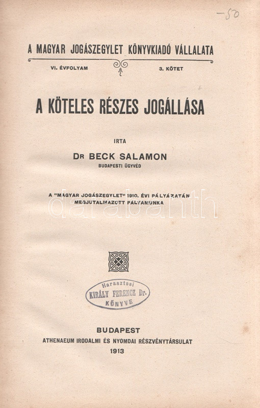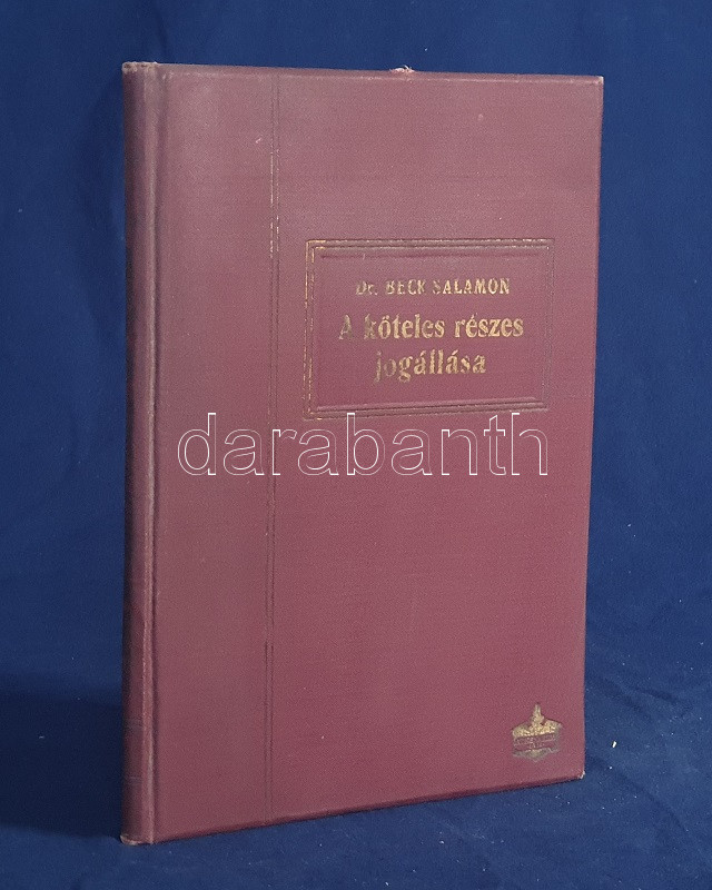 Beck Salamon: A köteles részes jogállása. A ,,Magyar Jogászegylet" 1910. évi pályázatán megjutalmazott pályamunka. Budapest, 1913. Athenaeum Irodalmi és Nyomdai Részvénytársulat. 77 + [3] p. Egyetlen kiadás. Beck Salamon (1885-1974) jogtudós, jogi szakíró korai munkája, első kötete. A szerző 1929-1931 között az egységes bírói és ügyvédi vizsgabizottság tagja, a második világháború után az ELTE tanszékvezető egyetemi tanára volt. (A Magyar Jogászegylet könyvkiadó vállalata, VI. évfolyam, 3. kötet.) Aranyozott, enyhén foltos kiadói egészvászon kötésben, márványmintás festésű lapszélekkel. Jó példány.