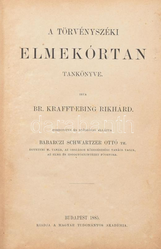 Br. Krafft-Ebing Rikhárd: A törvényszéki elmekórtan tankönyve. Bp., 1885, MTA. Kiadói egészvászon kötés, sérült gerinc, viseltes állapotban.