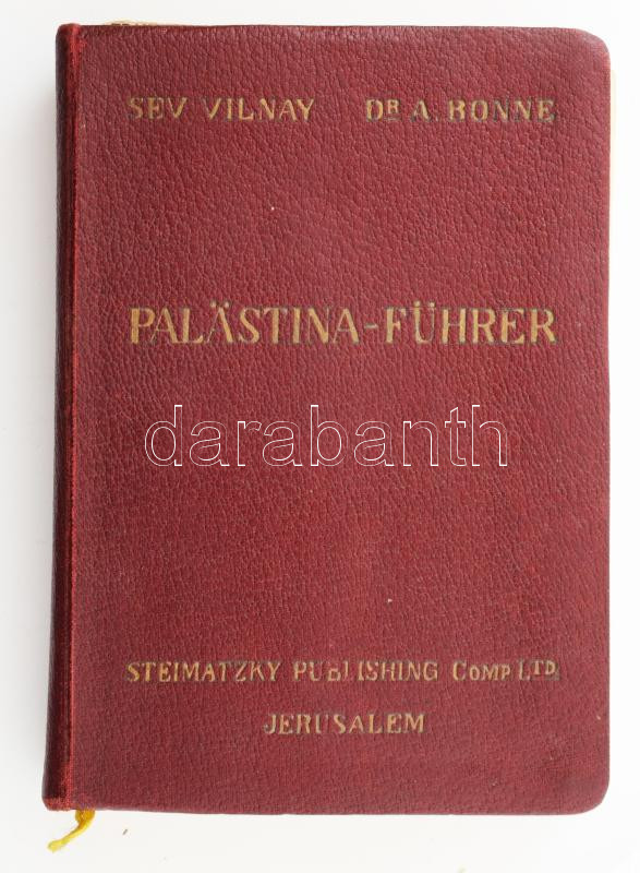 Zev Vilnay - Dr. A. Bonne: Steimatzky's Palästina-Führer. Jerusalem, 1935, Steimatzky Publishing Comp. Ltd., 8 sztl. lev.+ CLXXVI+(2)+451 p. + 1 melléklet (Palestine Railways Time Table, vasúti menetrend térképpel). Német nyelven. Kiadói egészvászon-kötés, a lapok egy része (1-60. old.) részben elvált a fűzéstől