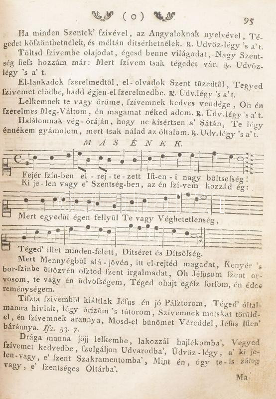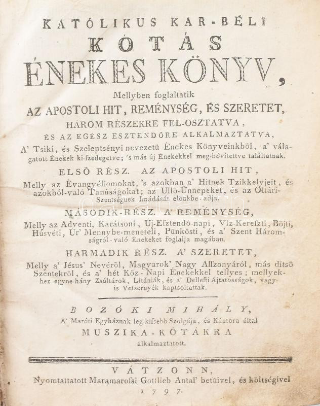 Bozóki Mihály: Katólikus kar-béli kótás énekes könyv, Mellyben foglaltatik az apostoli hit, reménység és szeretet, három részekre fel-osztatva [...] Vátzonn, 1797, Maramarosi Gottlieb Antal-ny., 320 p. (eredetileg 323 p.) Korabeli, bordázott gerincű egészbőr-kötésben, kissé foltos, sérült borítóval, helyenként kissé sérült lapokkal, kisebb (néhol szöveget is érintő) hiányokkal, ceruzás aláhúzásokkal, régi tulajdonosi bélyegzőkkel, a címkép és az utolsó lapok hiányoznak.