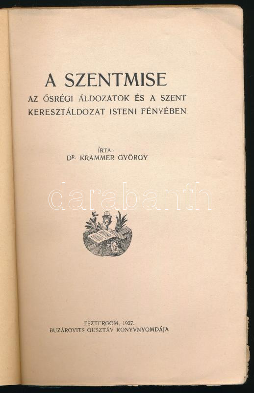 Krammer György: A szentmise. Az ősrégi áldozatok és a szent keresztáldozat isteni fényében. Esztergom, 1927., Buzárovits Gusztáv, 182 p. Kiadói papírkötés, javított gerinccel, a címlap utáni lapon possessori bejegyzéssel.