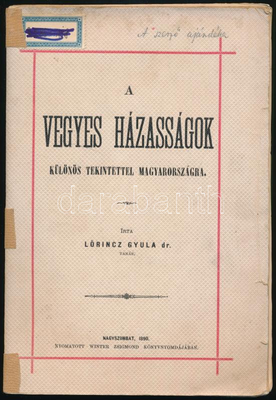 Lőrincz Gyula: A vegyes házasságok különös tekintettel Magyarországra. Nagyszombat, 1890, Winter Zsigmond, 175+1 p. Kiadói papírkötés, a gerincen javítással, címkével, kissé foltos, kissé szakadt borítóval, régi áthúzott intézményi bélyegzésekkel, a címlapon névbejegyzéssel, a borítón: "A szerző ajándéka."